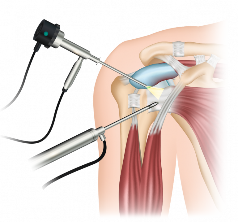 In der Regel werden wenige kleine Schnitte für die Operation benötigt, über die wir das Arthroskop oder die Arbeitsinstrumente in das Gelenk einführen. Nach Auffüllen des Gelenks mit einer Spüllösung und Einbringen der Kamera können wir alle wichtigen Strukturen (Sehnen, Bänder, Schleimbeutel, Knorpel etc.) auf einem Monitor sehen und exakt beurteilen. In derselben Sitzung können je nach Befund Spezialinstrumente in das Gelenk eingebracht werden, um auf diese Weise Schäden und Verletzungen an der Schulter direkt behandeln zu können.